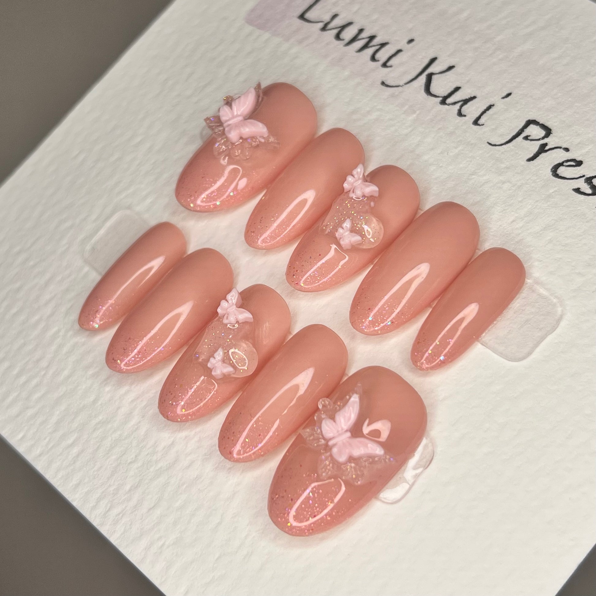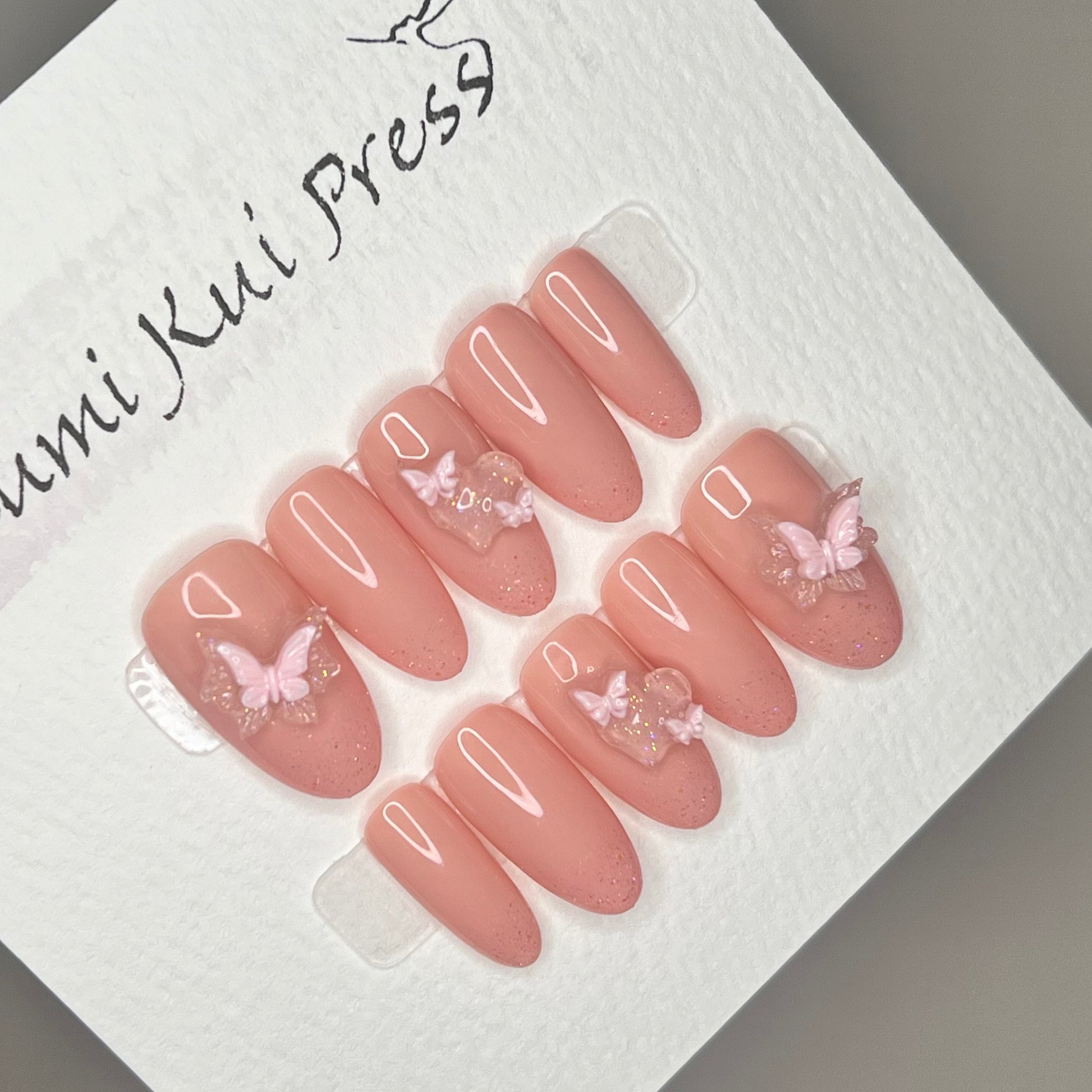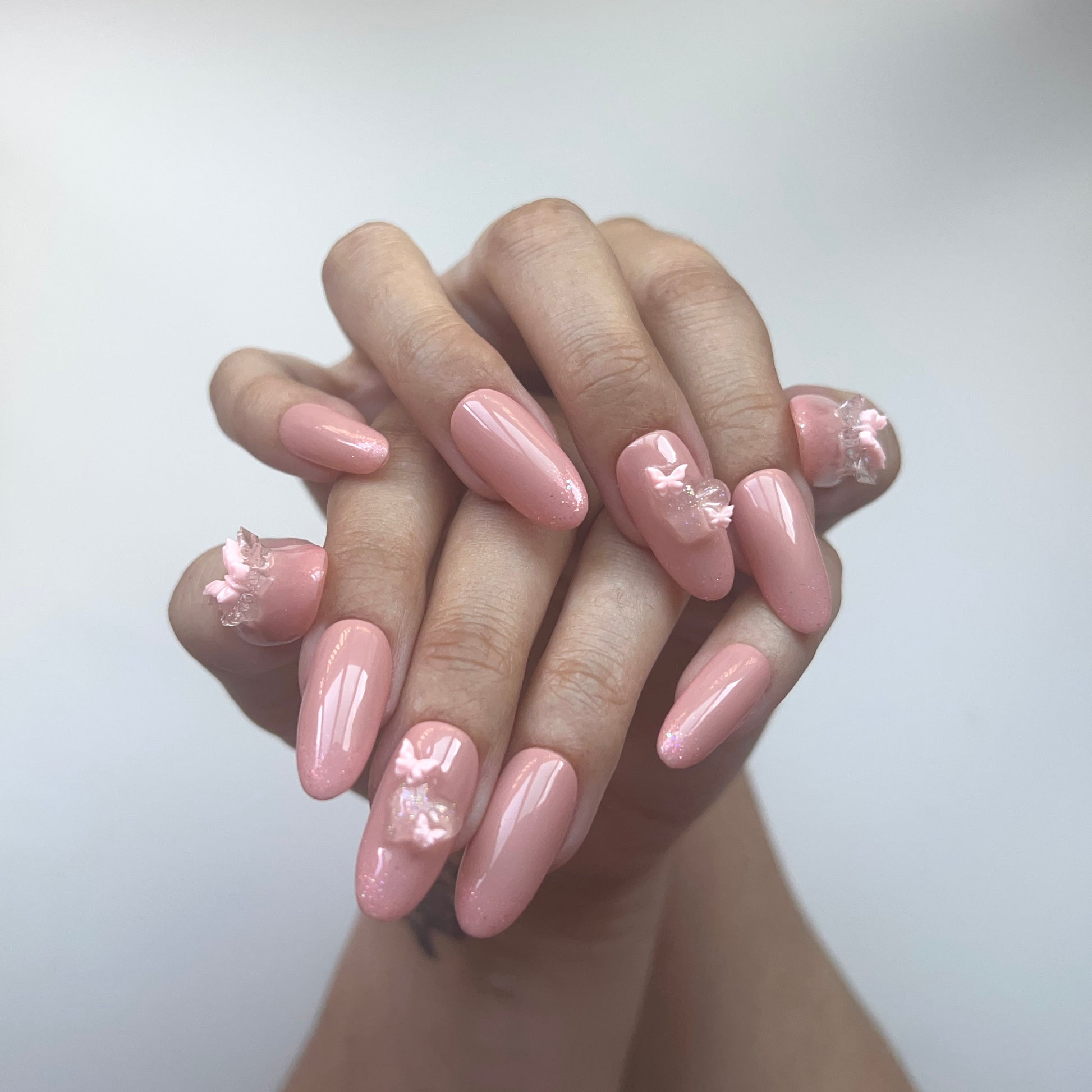 These multilayer glitter French tip beauties sparkle with every move. The butterfly and heart charms went so perfectly with my chosen colors— let’s just say I was a very happy artist.